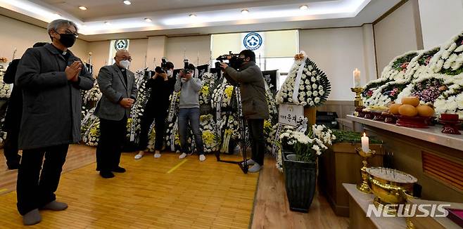 [광주=뉴시스] 변재훈 기자 = 김영식 대표신부를 비롯한 천주교정의구현전국사제단 일행이 10일 광주 동구 조선대병원 장례식장에 마련된 고(故) 이한열 열사의 모친 배은심 여사의 빈소를 찾아 조문하고 있다. 2022.01.10. wisdom21@newsis.com