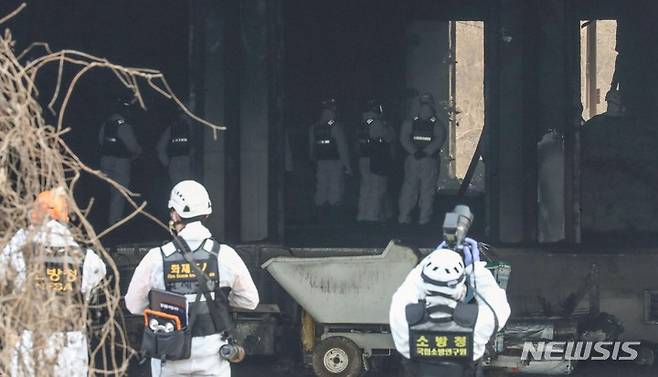 [평택=뉴시스] 김종택 기자 = 소방관 3명이 순직한 경기도 평택 냉동창고 신축 공사장 화재현장에서 10일 오전 경찰과 소방, 국과수 등 관계자들이 합동감식을 하고 있다. (공동취재사진) 2022.01.10. photo@newsis.com