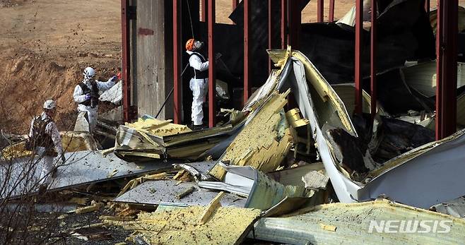 [평택=뉴시스] 김종택 기자 = 소방관 3명이 순직한 경기도 평택 냉동창고 신축 공사장 화재현장에서 10일 오전 경찰과 소방, 국과수 등 관계자들이 합동감식을 하고 있다. (공동취재사진) 2022.01.10. photo@newsis.com