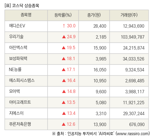 [fnRASSI]장마감, 코스닥 상승 종목(에디슨EV 30.0% ↑)