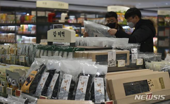 [대구=뉴시스] 이무열 기자 = 설 명절을 앞둔 10일 대구 중구 계산동 현대백화점 식품관에서 구청 식품위생과 직원들이 설 성수식품 점검을 하고 있다. 2022.01.10. lmy@newsis.com