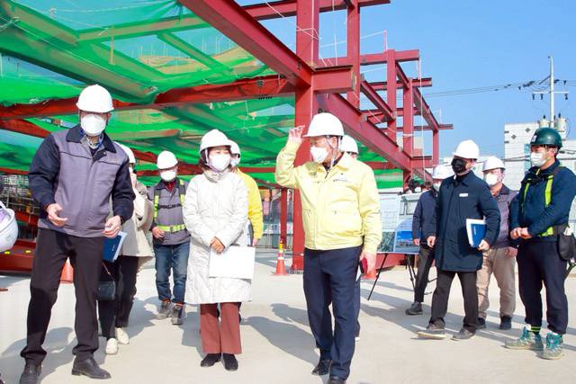 [사천=뉴시스] 차용현 기자 = 10일 오후 경남 사천시 홍민희 사천시장 권한대행이 관내 신축공사장 등을 찾아 동절기 건설현장 안전관리와 코로나19 방역대책을 점검하고 있다. (사진=사천시 제공) 2022.01.10. photo@newsis.com