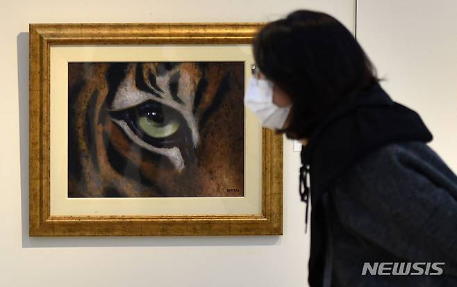 [대구=뉴시스] 이무열 기자 = 10일 오후 대구 달서구 대곡동 정부대구지방합동청사 갤러리에서 열린 '호랑이 展'을 찾은 시민이 다양한 호랑이 그림을 감상하고 있다. 정부대구지방합동청사는 올해 지역 문화예술 활성화를 위해 수묵화, 한국화, 서양화, 서각 등 다양한 분야의 작품을 매월 3주씩 총 11회 전시한다. 2021.01.10. lmy@newsis.com