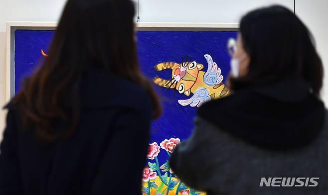 [대구=뉴시스] 이무열 기자 = 10일 오후 대구 달서구 대곡동 정부대구지방합동청사 갤러리에서 열린 '호랑이 展'을 찾은 시민들이 다양한 호랑이 그림을 감상하고 있다. 정부대구지방합동청사는 올해 지역 문화예술 활성화를 위해 수묵화, 한국화, 서양화, 서각 등 다양한 분야의 작품을 매월 3주씩 총 11회 전시한다. 2021.01.10. lmy@newsis.com