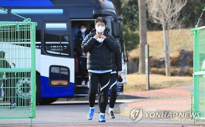 (서귀포=연합뉴스) 변지철 기자 = 남자 23세 이하(U-23) 대표팀 황선홍 감독이 10일 제주 서귀포 공천포전지훈련장에 들어서고 있다. 2022.1.10