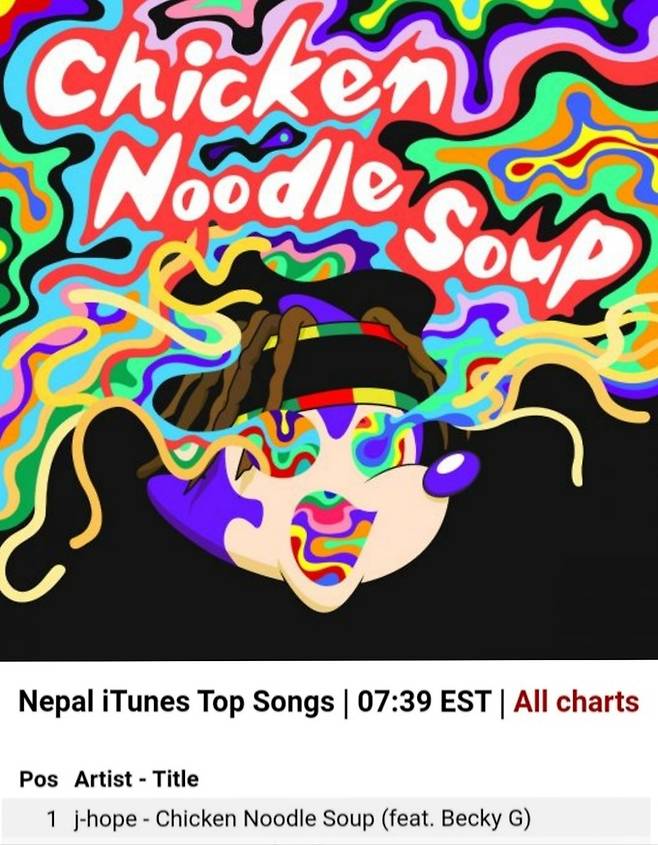 10일 아이튠즈 차트에 따르면 '치킨 누들 수프'는 지난 6일 네팔 싱글 차트 1위에 오르는 등 지금까지 총 103개국에서 1위를 차지했다.