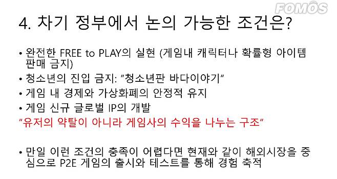 차기 정부에서는 P2E 게임에 캐릭터 및 확률형 아이템 판매 금지, 청소년 진입 금지, 게임 내 경제와 가상화폐의 안정적 유지, 게임 신규 글로벌 IP 개발 등의 조건을 충족해 게임사가 게이머에 수익을 나누는 구조를 갖춰야 한다. 조건 충족이 어렵다면 해외 시장을 중심으로 P2E 게임의 출시와 테스트로 경험을 축적해야 한다고 주장했다.