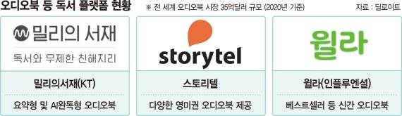 이에 밀리의서재, 스토리텔, 윌라 등이 각축을 벌이고 있다. KT 미디어 그룹사 지니뮤직이 464억원을 투자해 최대주주에 오른 밀리의서재는 연내 기업공개(IPO)를 추진할 예정이다.