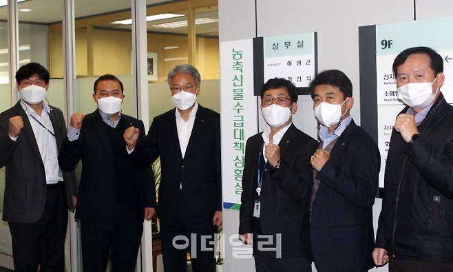 [이데일리 김태형 기자] 농협경제지주 하명곤(왼쪽 세번째) 품목지원본부장과 관계 부서장들이 10일 농협중앙회 본관에서 '농축산물 수급대책 상황실' 현판식을 갖고 있다.