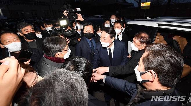 [광주=뉴시스] 변재훈 기자 = 윤석열 국민의힘 대선 후보가 10일 오후 고(故) 이한열 열사의 모친 배은심 여사의 빈소를 조문한 뒤 차량에 타기 앞서 당직자들과 인사를 나누고 있다. 2022.01.10. wisdom21@newsis.com