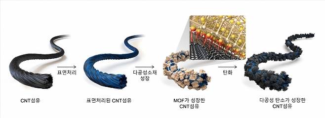 연구팀은 탄소나노튜브 섬유에 표면처리를 한 후 다공성 탄소를 성장시켜 고강도 섬유형 슈퍼커패시터(super capacitor)를 제작했다.