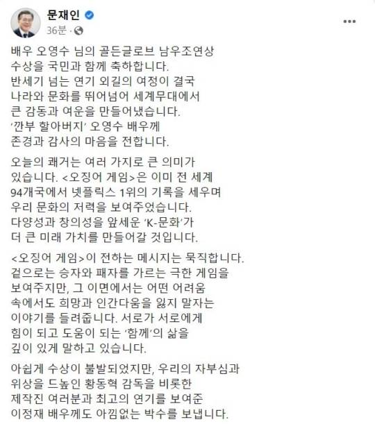끝으로 문 대통령은 "아쉽게 수상이 불발됐지만, 우리의 자부심과 위상을 드높인 황동혁 감독을 비롯한 제작진 여러분과 최고의 연기를 보여준 이정재 배우께도 아낌없는 박수를 보낸다"고 남겼다.