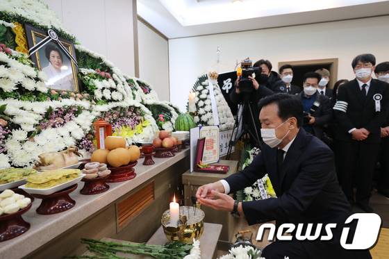 (광주=뉴스1) 사진공동취재단 = 손학규 무소속 대선 후보가 10일 오후 광주 조선대학교병원 장례식장에 마련된 고(故) 이한열 열사 어머니 배은심 여사 빈소에서 조문하고 있다. 2022.1.10/뉴스1