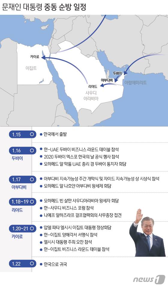 (서울=뉴스1) 윤주희 디자이너 = 문재인 대통령은 오는 15일부터 22일까지 6박8일 일정으로 아랍에미리트(UAE), 사우디아라비아, 이집트까지 중동 3개국을 방문한다.