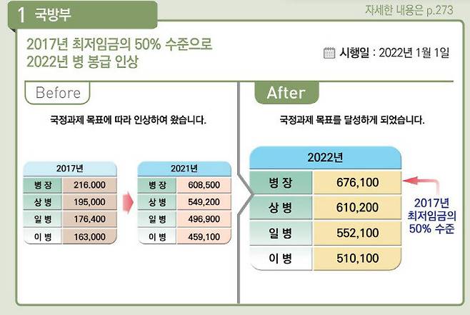 올해 병사 월급은 △병장 67만6100원 △상병 61만200원 △일병 55만2100원 △이병 51만원이다. 문재인 정부 들어서 병사 월급은 3배 가량 올랐다. 문재인 정부 출범 당시 2017년 기준 21만6천원이었던 병장 월급은 올해 67만6100원으로 올랐지만, 최저임금(월 191만원)의 3분의 1을 약간 넘는 수준에 불과하다. 병장 월급은 이명박 정부 때인 2010년엔 9만7500원이었고, 박근혜 정부 말기였던 2016년엔 19만7000원이었다.