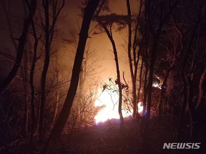 [이천=뉴시스] 10일 오후 6시9분께 경기 이천시 마장면 소재 설봉산 정상에서 불이 났다. 소방당국은 화재 발생 2시간여 만인 오후 8시께 대응 1단계를 발령하고, 펌프차 등 장비와 인력을 투입해 진화 작업 중이다. 2022.1.10. (사진=경기도 소방재난본부 제공)