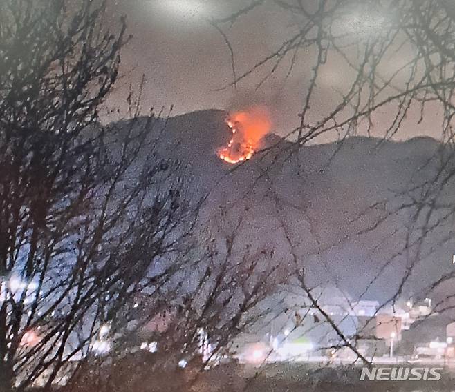 [이천=뉴시스] 10일 오후 6시9분께 경기 이천시 마장면 소재 설봉산 정상에서 불이 났다. 소방당국은 화재 발생 2시간여 만인 오후 8시께 대응 1단계를 발령하고, 펌프차 등 장비와 인력을 투입해 진화 작업 중이다. 2022.1.10. (사진=경기도 소방재난본부 제공)