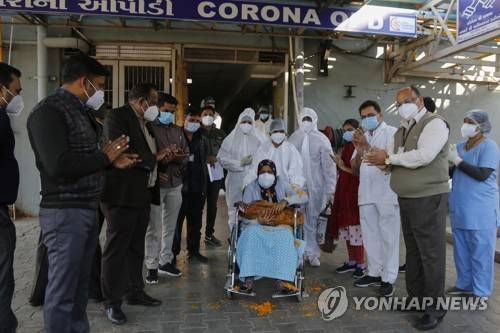 Health workers applaud as a COVID-19 positive woman, who delivered a baby while undergoing treatment at a COVID-19 hospital is shifted out for home quarantine in Ahmedabad, India, Monday, Jan. 10, 2022. (AP Photo/Ajit Solanki)