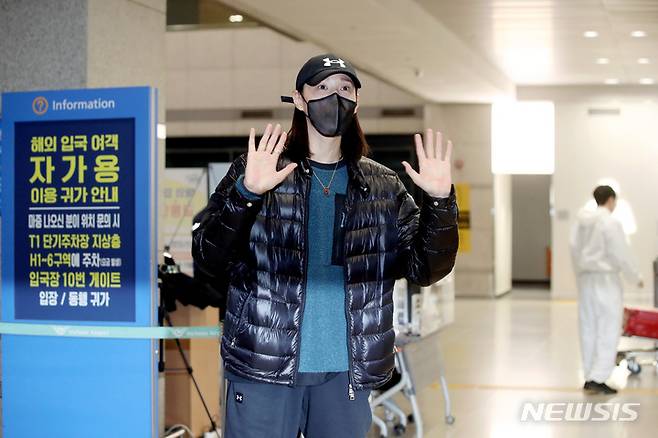[인천공항=뉴시스] 김병문 기자 = 2021-2022 중국여자프로배구 슈퍼리그를 마친 김연경이 10일 오후 인천국제공항을 통해 귀국하고 있다. 2022.01.10. dadazon@newsis.com