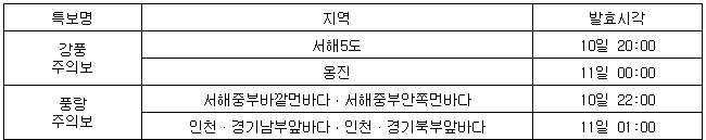 인천·경기남부 앞바다·인천·경기북부 앞바다에는 풍랑주의보가 발효된다.