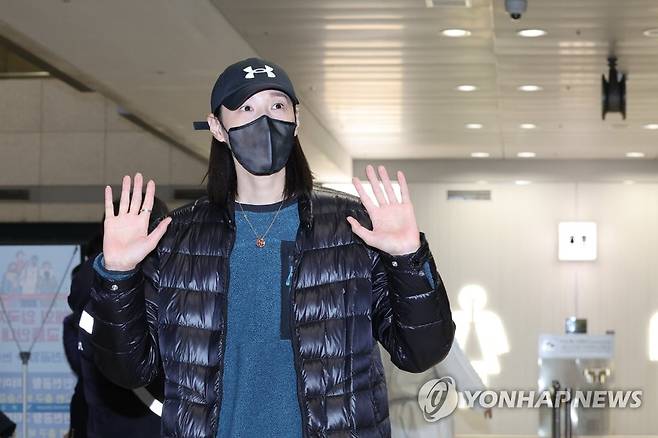 (영종도=연합뉴스) 임화영 기자 = 한국 여자배구 간판 김연경이 중국여자배구 슈퍼리그를 마친 뒤 10일 오후 인천국제공항을 통해 귀국하고 있다. 2022.1.10