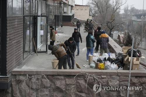 People clean an area near a shop damaged during clashes in Almaty, Kazakhstan, Monday, Jan. 10, 2022. The National Security Committee, Kazakhstan's counterintelligence and anti-terrorism agency, said that the situation in the country has "stabilized and is under control." (AP Photo)