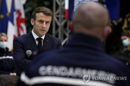 France's President Emmanuel Macron listens to a police officer during a meeting in Nice, southern France, Monday, Jan. 10, 2022. President Emmanuel Macron traveled to the French Mediterranean coast on Monday to talk about internal security, making a pit stop in the city where an extremist drove a cargo truck into Bastille Day crowds in 2016, killing 86 people and injuring hundreds more. (AP Photo/Daniel Cole, Pool) POOL PHOTO
