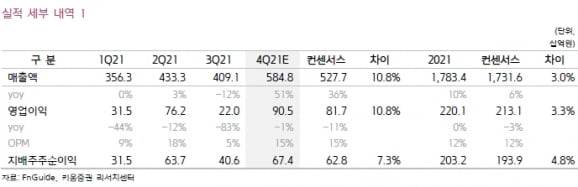 지난해 4분기 매출과 영업이익은 각각 5848억원과 905억원으로 예상했다. 매출은 전년 동기 및 전분기 대비 각각 51%와 43% 늘어난 수치다. 영업이익은 전년 같은 기간보다 1% 감소하고, 전분기보다는 311% 증가할 것이란 추정이다. 컨센서스 대비로는 매출과 영업이익 모두 10.8% 웃돌 것으로 봤다.