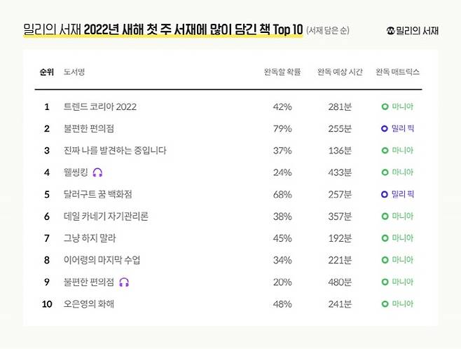 구독 서비스인 밀리의 서재가 이 기간동안 회원들이 서재에 가장 많이 담은 도서 상위 50권을 분석했더니 2022년에 대한 전망과 분석을 담은 트렌드 전망서가 부상한 것으로 나타났다. 김난도 교수의 '트렌드 코리아 2022'는 지난해 12월 밀리의 서재에서 공개된 지 한 달 만에 서재에 가장 많이 담긴 도서 1위를 기록했다. 이외에도 '2022 한국경제 대전망', '2022 콘텐츠가 전부다', '이코노미스트 2022 세계대전망' 등 각 분야의 새해 전망을 담은 도서들이 순위권에 들었다.