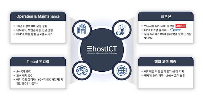 이호스트ICT는 18년 이상의 인터넷데이터센터(IDC) 운영 경험과 노하우를 바탕으로 그래픽저장장치(GPU) 서버·호스팅, 네트워크, 보안관제 등 IT 토털 서비스를 제공해왔다. 지난해부터 AI GPU 서버 전문 브랜드 AIOCP를 비롯해 IDC 부문의 B2B컨설팅, 클라우드, BGP&IX를 통한 글로벌 서비스 등으로 사업 범위를 확장하고 있다.