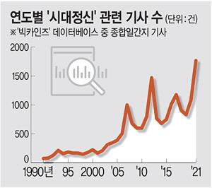 그러나 한국에서는 이 용어를 유독 선거와 연결지어 사용하는 경향이 강하다. 한국언론진흥재단이 운영하는 뉴스 빅데이터 분석 시스템 ‘빅카인즈’에 ‘시대정신’이라는 키워드를 입력해 분석해 보면, 17대 대선이 치러진 2007년부터 이 용어가 한국에서 널리 사용되기 시작했음을 알 수 있다. 빅카인즈 데이터베이스에 포함된 1990년 1월 1일자부터 2022년 1월 10일자(오전 현재)까지 11개 종합일간지에 실린 시대정신 관련 기사는 총 1만8012건이다. 1990년 72건을 시작으로 매년 100∼200건 수준이던 기사가 노무현 정부 말기인 2006년 509건, 2007년 1017건으로 급증했다. 이후에는 연간 600건 안팎 수준이다가 18대 대선이 있던 2012년(1522건), 19대 대선이 치러진 2017년(1181건) 등 5년마다 큰 폭으로 늘어나는 추세를 보였다. 20대 대선을 앞둔 2020년(1097건)과 2021년(1787건)에도 큰 폭의 증가를 보였다.