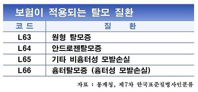 즉, 탈모 가운데서도 보험이 적용되는 질환이 있습니다. 총 진료비 388억 원의 기준이 되는 탈모 질환은 다음과 같습니다.