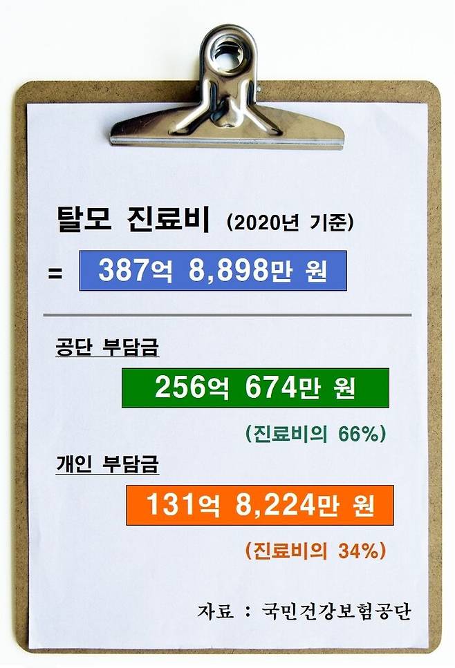 즉, 총 진료비 388억 가운데 공단 부담금은 256억 674만 원, 전체의 66%이며, 개인 부담금은 131억 8,224만 원, 전체의 34%였습니다. 정리하면, '보험이 적용되는' 탈모 환자의 진료비를 따져보면, 국가가 지는 부담은 388억 원이 아니라 250억 원 정도로 보는 게 맞습니다.