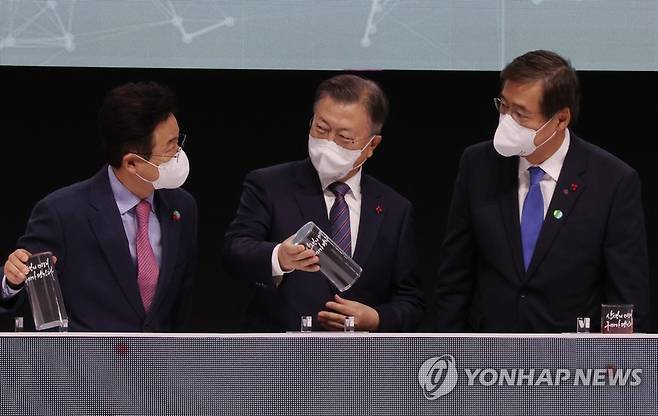 (구미=연합뉴스) 서명곤 기자 = 문재인 대통령이 11일 오전 경북 구미시 구미코에서 열린 구미형 일자리 LG BCM(Battery Core Material) 공장 착공식에서 양극재를 담은 아크릴 용기를 터치버튼 테이블 홈에 넣는 착공 세리머니를 한 뒤 신학철 LG화학 부회장 등과 대화하고 있다. 왼쪽부터 이철우 경북도지사, 문재인 대통령, 신학철 부회장. 2022.1.11