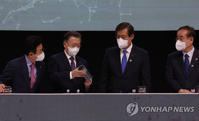 (구미=연합뉴스) 서명곤 기자 = 문재인 대통령이 11일 오전 경북 구미시 구미코에서 열린 구미형 일자리 LG BCM(Battery Core Material) 공장 착공식에서 양극재를 담은 아크릴 용기를 터치버튼 테이블 홈에 넣는 착공 세리머니를 한 뒤 신학철 LG화학 부회장 등과 대화하고 있다. 왼쪽부터 이철우 경북도지사, 문재인 대통령, 신학철 부회장, 장세용 구미시장. 2022.1.11