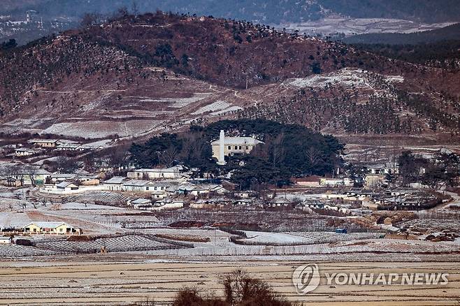 (파주=연합뉴스) 임병식 기자 = 북한이 탄도미사일로 추정되는 발사체를 엿새 만에 다시 발사한 11일 경기도 파주시 오두산 통일전망대에서 바라본 북한 황해북도 개풍군 일대에 눈이 쌓여 있다. 2022.1.11