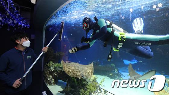 (수원=뉴스1) 김영운 기자 = 11일 오후 경기도 수원시 영통구 아쿠아플라넷 광교에서 새해를 맞아 다이버와 관계자가 수조 청소를 하고 있다. 2022.1.11/뉴스1