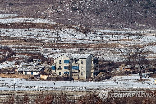 (파주=연합뉴스) 임병식 기자 = 북한이 탄도미사일로 추정되는 발사체를 엿새 만에 다시 발사한 11일 경기도 파주시 오두산 통일전망대에서 바라본 북한 황해북도 개풍군 일대에 눈이 쌓여 있다. 2022.1.11