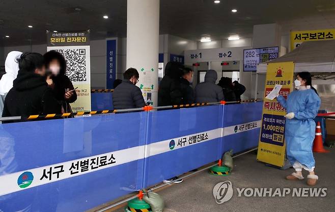 (광주=연합뉴스) 조남수 기자 = 11일 광주 서구보건소 선별진료소에서 시민들이 코로나19 검사를 받기 위해 줄 서 대기하고 있다. 광주에서 전날 총 176명의 코로나19 신규 확진자가 발생, 일일 발생 기준 최대치를 기록했다. 2022.1.11