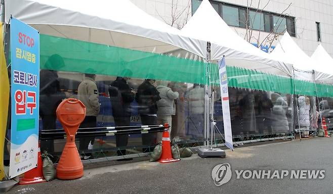 (광주=연합뉴스) 조남수 기자 = 11일 광주 서구보건소 선별진료소에서 시민들이 코로나19 검사를 받기 위해 줄 서 있다. 광주에서 전날 총 176명의 코로나19 신규 확진자가 발생, 일일 발생 기준 최대치를 기록했다. 2022.1.11