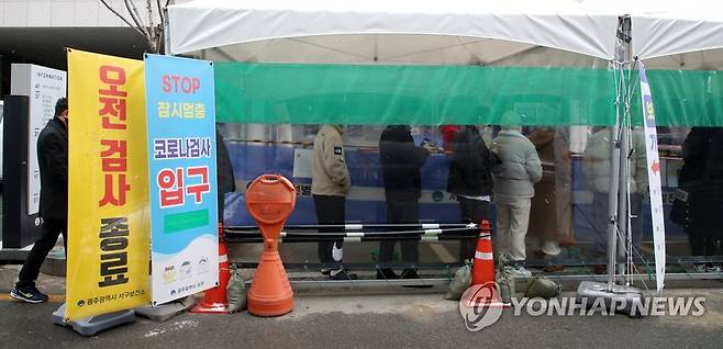 (광주=연합뉴스) 조남수 기자 = 11일 광주 서구보건소 선별진료소에서 시민들이 코로나19 검사를 받기 위해 줄 서 있다. 광주에서 전날 총 176명의 코로나19 신규 확진자가 발생, 일일 발생 기준 최대치를 기록했다. 2022.1.11