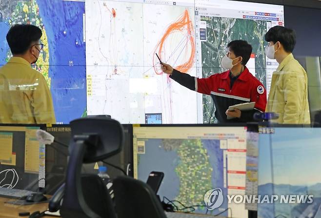 (대전=연합뉴스) 김준범 기자 = 11일 오후 대전시 서구 둔산동 정부대전청사산림청 중앙산림재난상황실에서 산림청 관계자가 산불 현황을 확인하고 있다. 산림청은 새해 들어 전국에 산불이 잇따라 발생하고 있어 각별한 주의를 당부했다. 2022.1.11