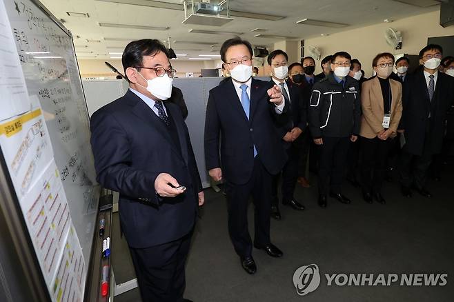 (여수=연합뉴스) 김주형 기자 = 김부겸 국무총리가 11일 오후 아프가니스탄 특별기여자 정착교육 현장 점검으로 임시 생활시설인 전남 여수 해양경찰교육원을 방문해 이재유 출입국본부장으로부터 현황보고를 받고 있다. 2022.1.11
