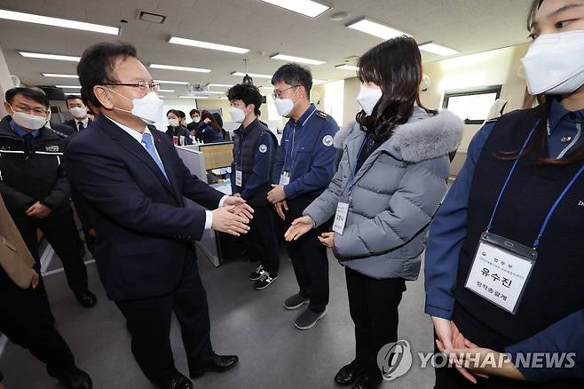 (여수=연합뉴스) 김주형 기자 = 김부겸 국무총리가 11일 오후 아프가니스탄 특별기여자 정착교육 현장 점검으로 임시 생활시설인 전남 여수 해양경찰교육원을 방문해 관계자들과 인사하고 있다. 2022.1.11