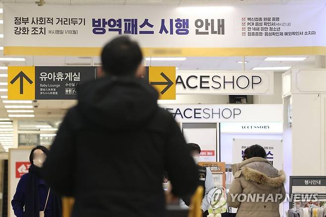 (서울=연합뉴스) 강민지 기자 = 11일 오후 서울의 한 대형마트 입구에 방역패스 시행 안내문이 내걸려 있다. 2022.1.11