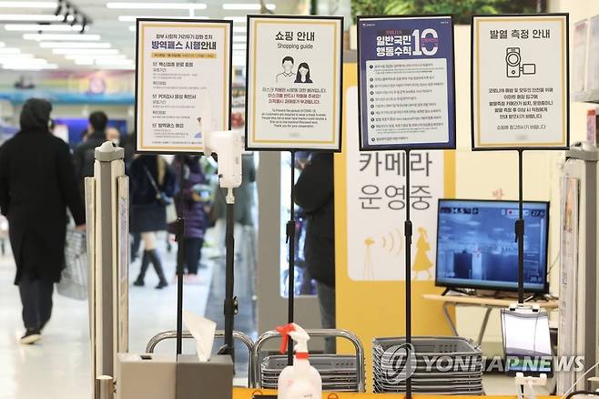 (서울=연합뉴스) 강민지 기자 = 11일 오후 서울의 한 대형마트 입구에 코로나19 관련 방역수칙 안내문들이 나열되어 있다. 2022.1.11