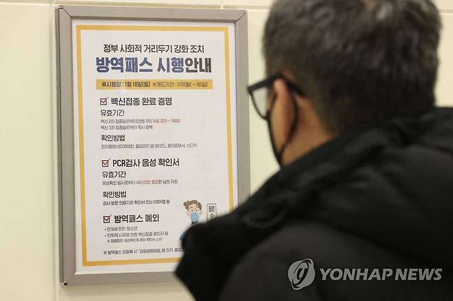 (서울=연합뉴스) 강민지 기자 = 11일 오후 서울의 한 대형마트 입구에서 이용객이 방역패스 시행 안내문을 읽고 있다. 2022.1.11