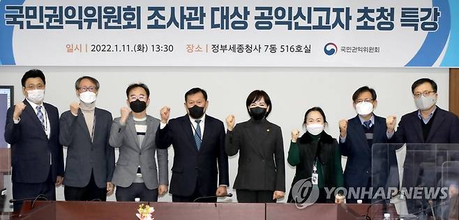 (서울=연합뉴스) 전현희 국민권익위원장(오른쪽 네 번째)이 11일 정부세종청사에서 영상으로 열린 국민권익위원회 조사관 대상 공익신고자 초청 특별강연에 참석해 현대차 결함 공익신고자 등 관계자들과 기념 촬영을 하고 있다. 2022.1.11
