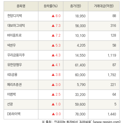 특히 한양디지텍은 전 거래일 대비 8.0% 오른 18,950원에 거래를 마감하여 높은 관심을 받았다.