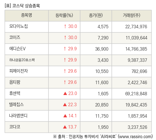 [fnRASSI]장마감, 코스닥 상승 종목(모다이노칩 30.0% ↑)